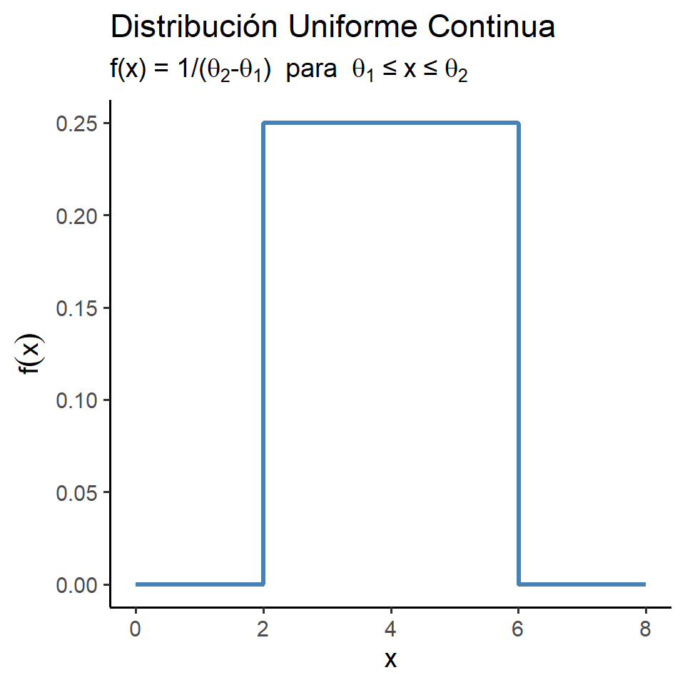 \[\small f_X(x)= \begin{cases} \dfrac{1}{\theta_2-\theta_1}, & \theta_1 \le x \le \theta_2,\\[6pt] 0, & \text{en cualquier otro punto.} \end{cases} \]