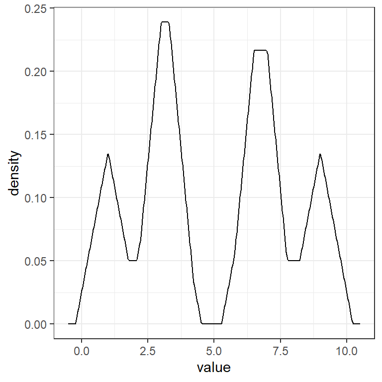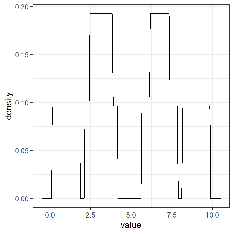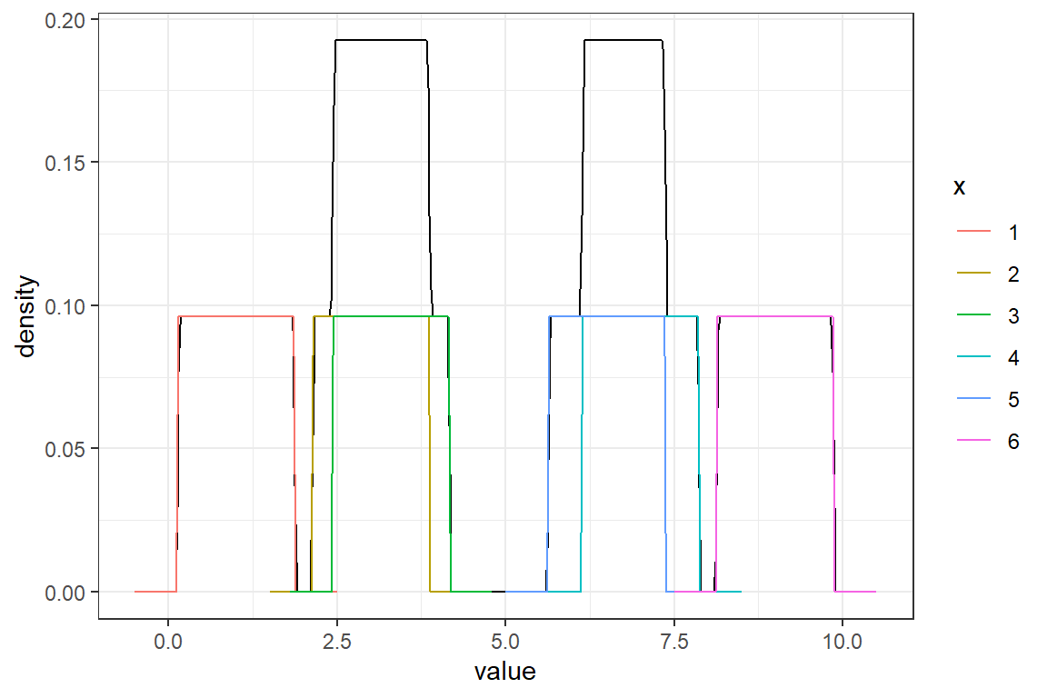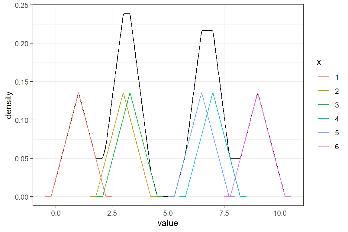 Ejemplo: Para una muestra de una población con distribución desconocida: \((1,3,3.3,7,6.5,9)\), estime la densidad usando el kernel triangular y \(h=0.5\).