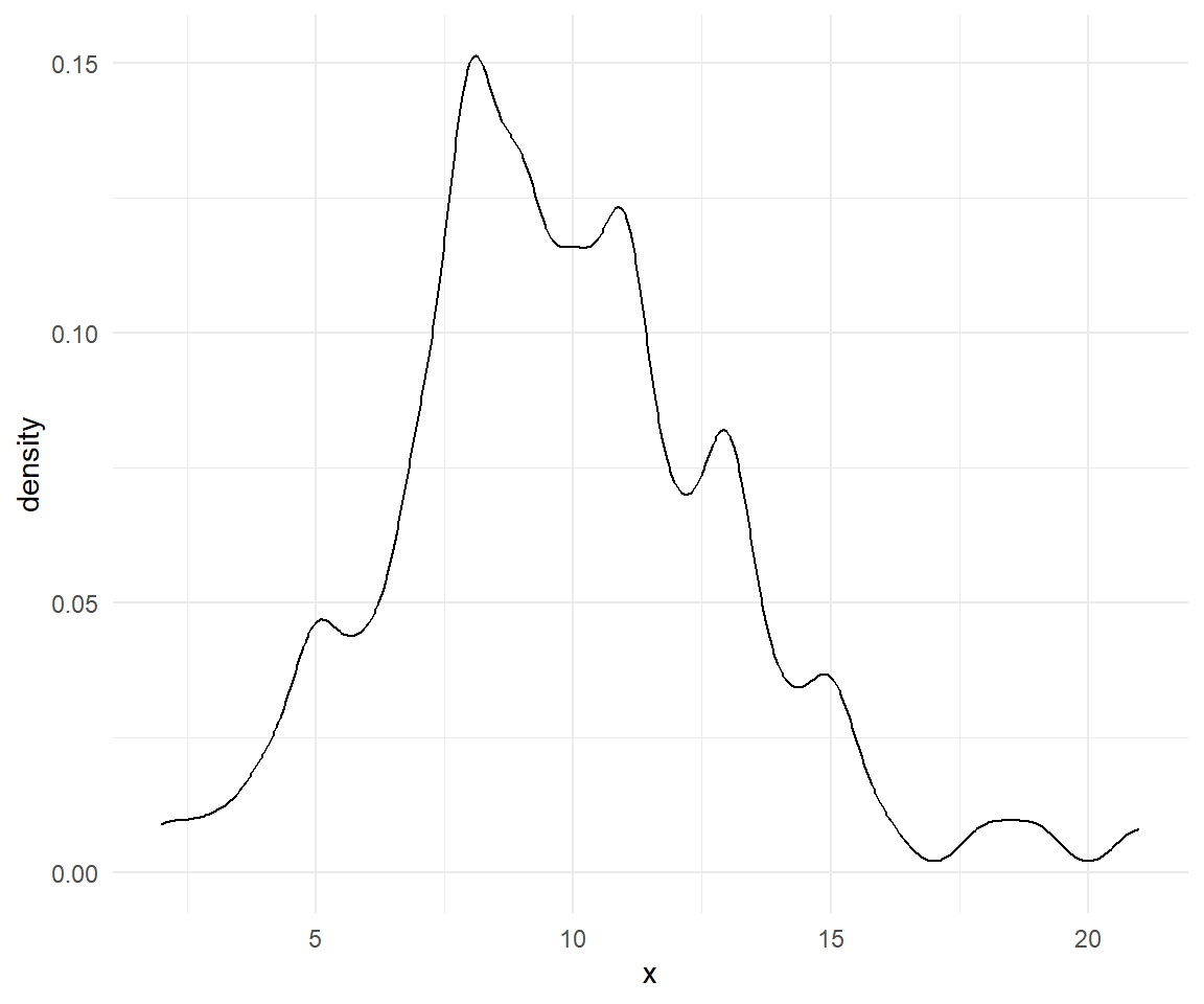 Ejemplo: Para una muestra de una población con distribución desconocida: \((1,3,3.3,7,6.5,9)\), estime la densidad usando el kernel gaussiano y \(h=0.5\).