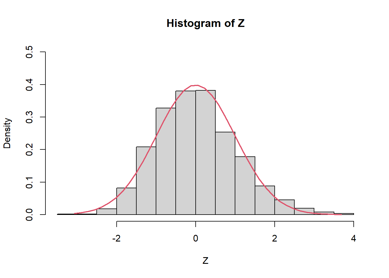 lines(Z2, dnorm(Z2, mean = 0, sd = 1), col = 2, lwd = 2)